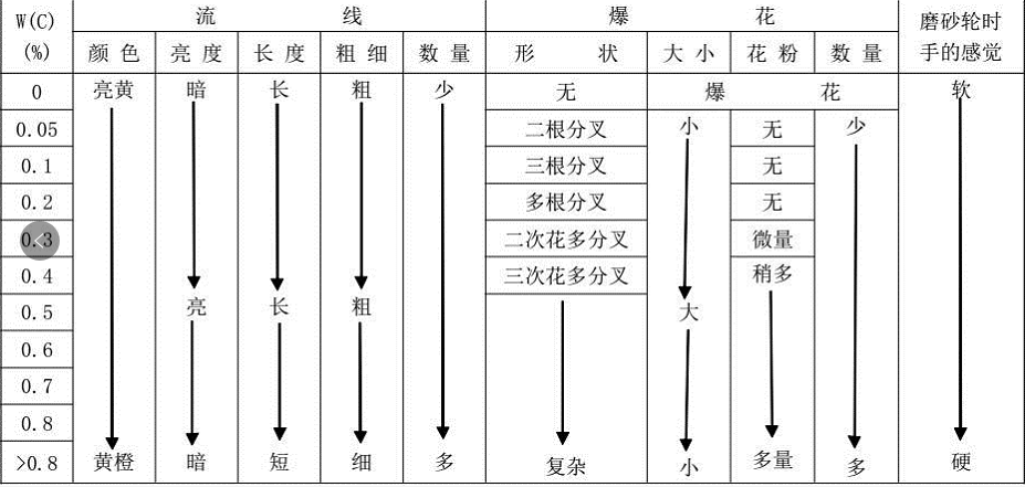 碳是钢铁材料火花的基本元素,也是火花鉴别法测定的主要成分。由于含碳量的不同,其火花形状不同。