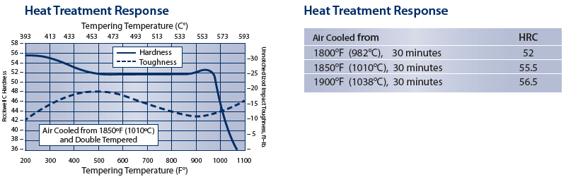 回火:淬火后立即回火。700oF(371oC)的典型回火范围将导致硬度约为51至53 HRC。但是,可以使用400至775℉(204-413℃)范围内的回火温度。在回火温度下保持每英寸(25.4mm)厚度1小时,但不少于4小时,然后空气冷却至环境温度。需要双重回火。为了最大限度地提高韧性,建议采用第三种方法。