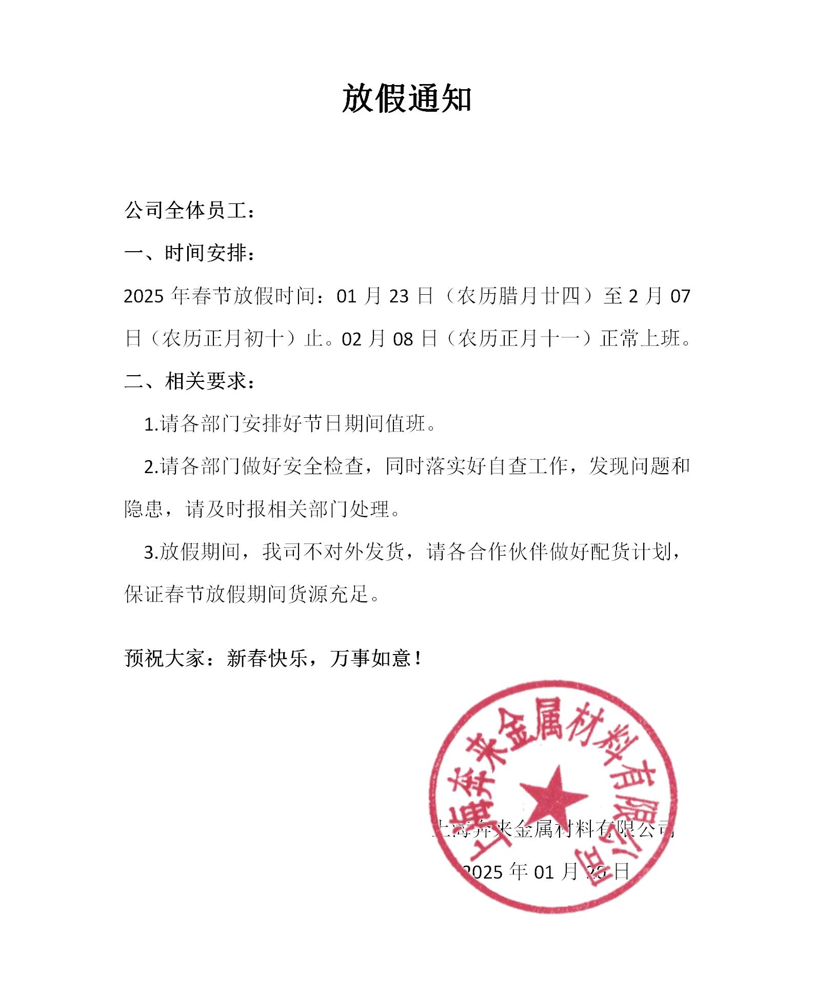 大家好!2025春节即将到来,上海奔来金属材料有限公司全体员工提前恭祝广大新老客户,新春快乐!非常感谢长期以来对我们工作的支持与理解。为方便您订货,请您错开假期,进行各事项安排。